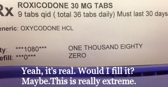 One of my chronic pain patients, “Alpha,” moved to Florida. About a year before that, I had received notification from the pharmacy chain management where I worked that it would be prudent for me to do a bit of CYA for myself and the company. I was to speak to the prescribers for my chronic pain patients and make notes in their profiles as to their diagnosis. In other words, why are these patients taking so much pain meds? When Alpha found out about this, she accused me of calling her a drug addict and causing her doctor to question her need for the meds. [Not her Rx shown above]
