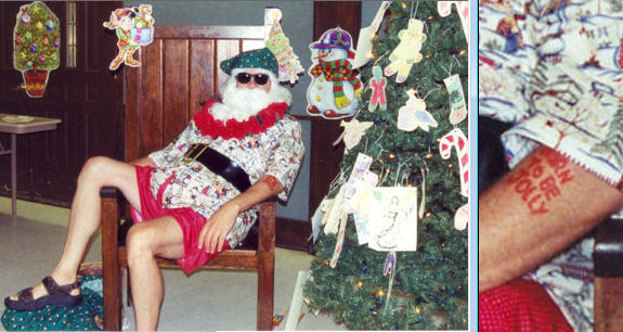 One summer over ten years ago, our church in Baton Rouge had “Christmas in July.” The usual “Santa” was unavailable so I got drafted. It was my only  and closest encounter with Sainthood. My wife made me a Hawaiian shirt with Christmas themed material, a do-rag, and I got a temporary tattoo.